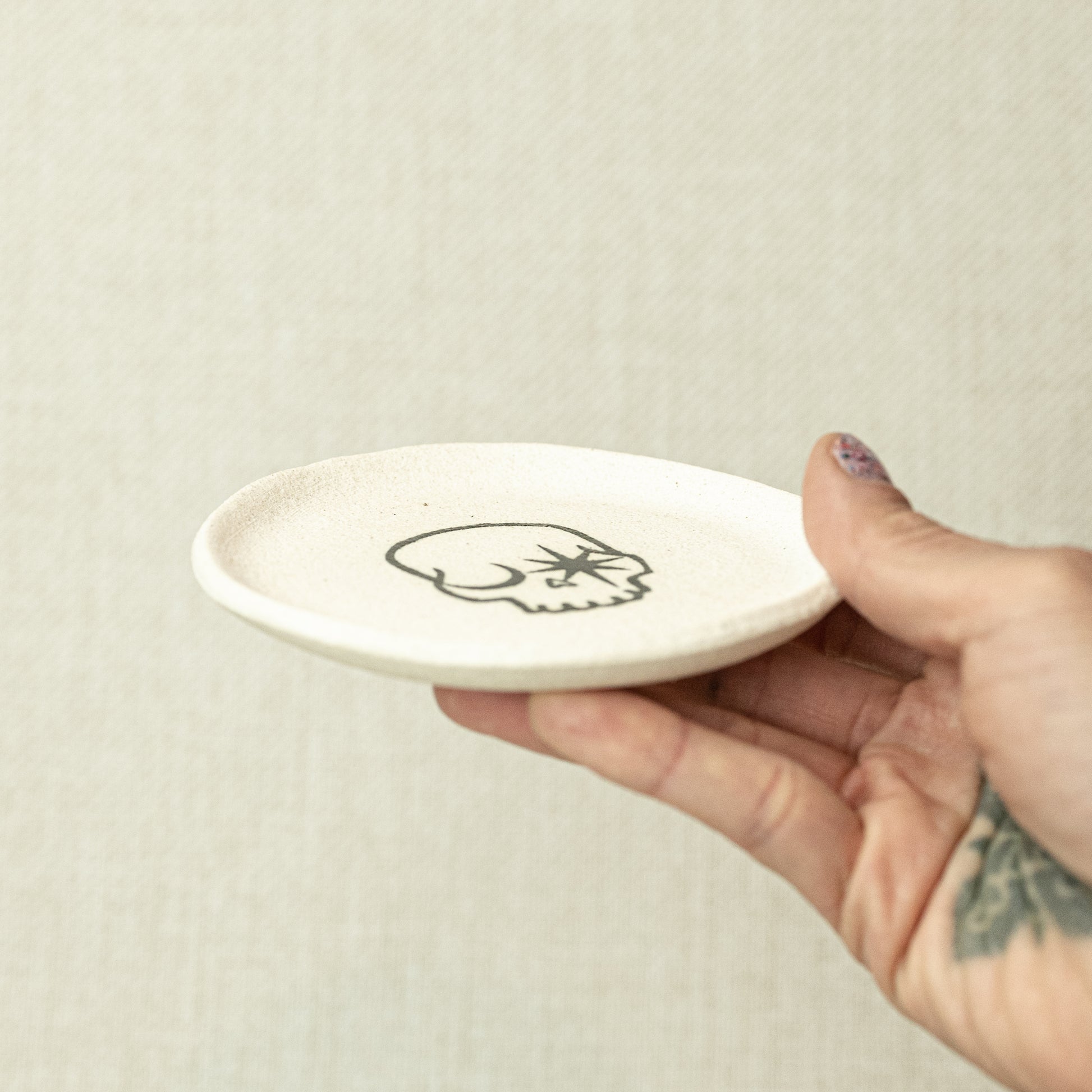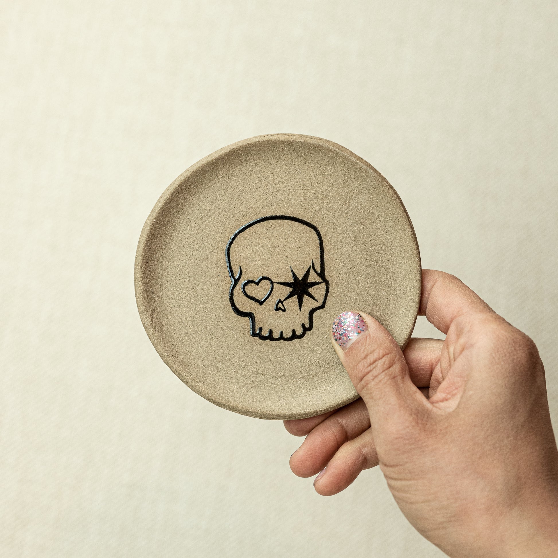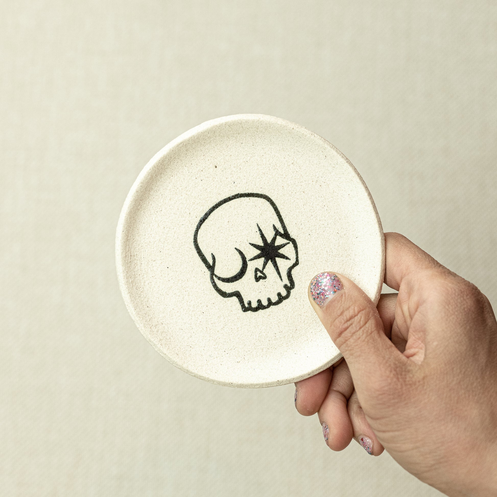 Ceramic stoneware handmade dish with hand painted accents of starry-eyed skull.