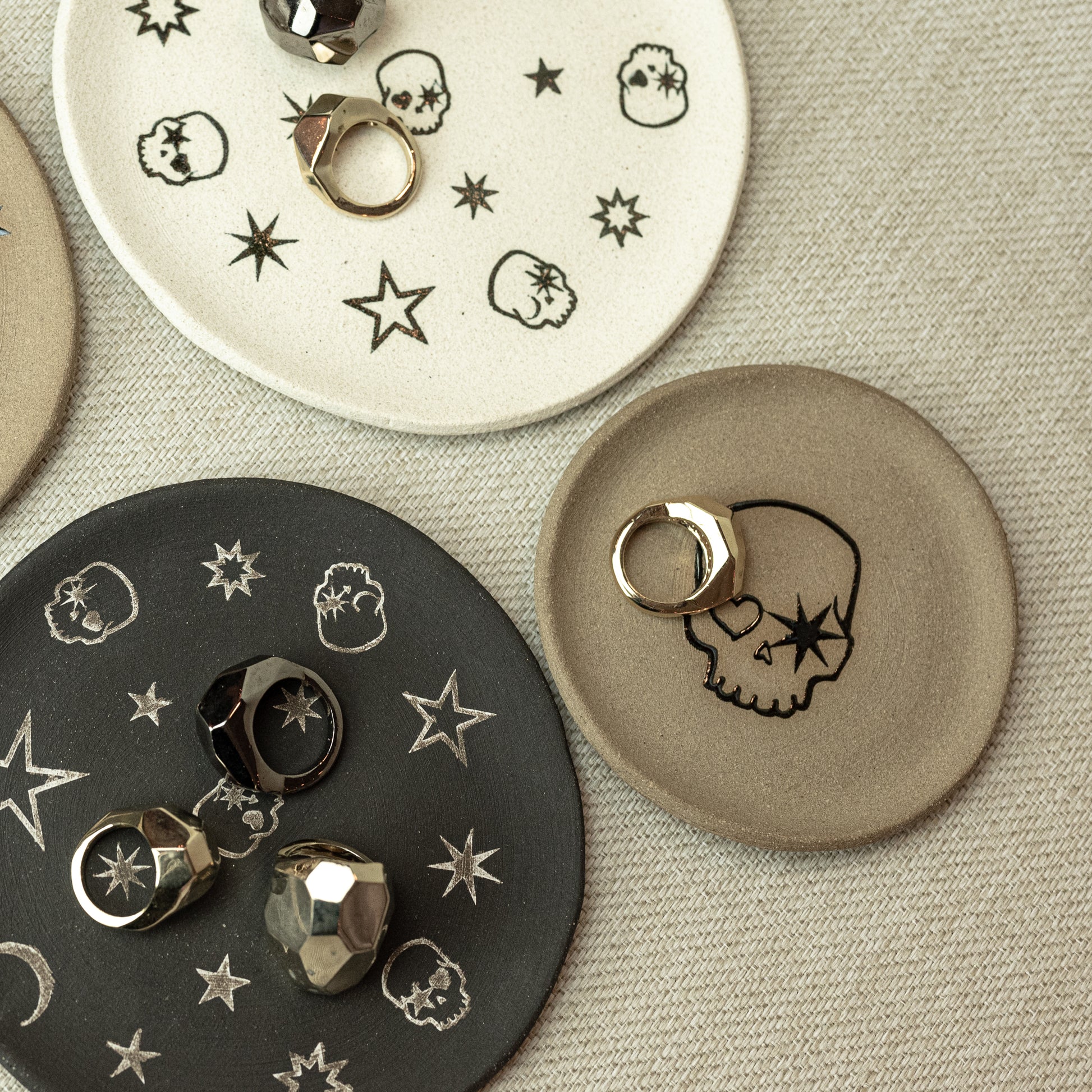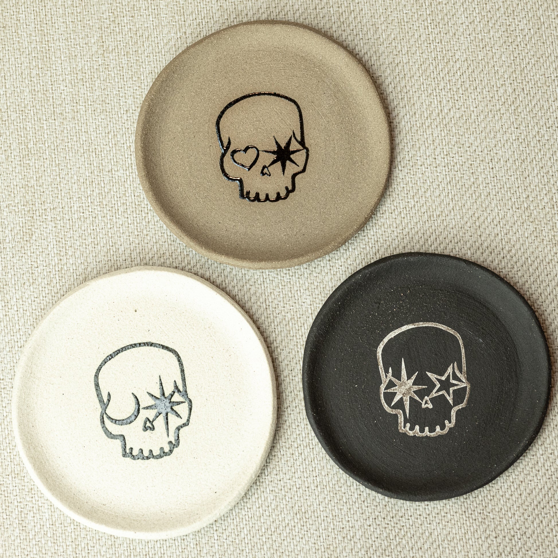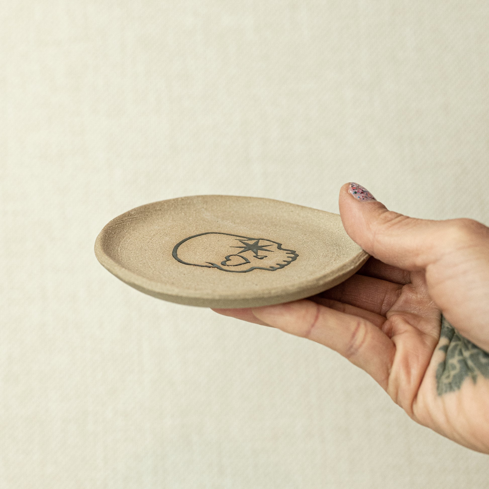 Ceramic stoneware handmade dish with hand painted accents of starry-eyed skull.